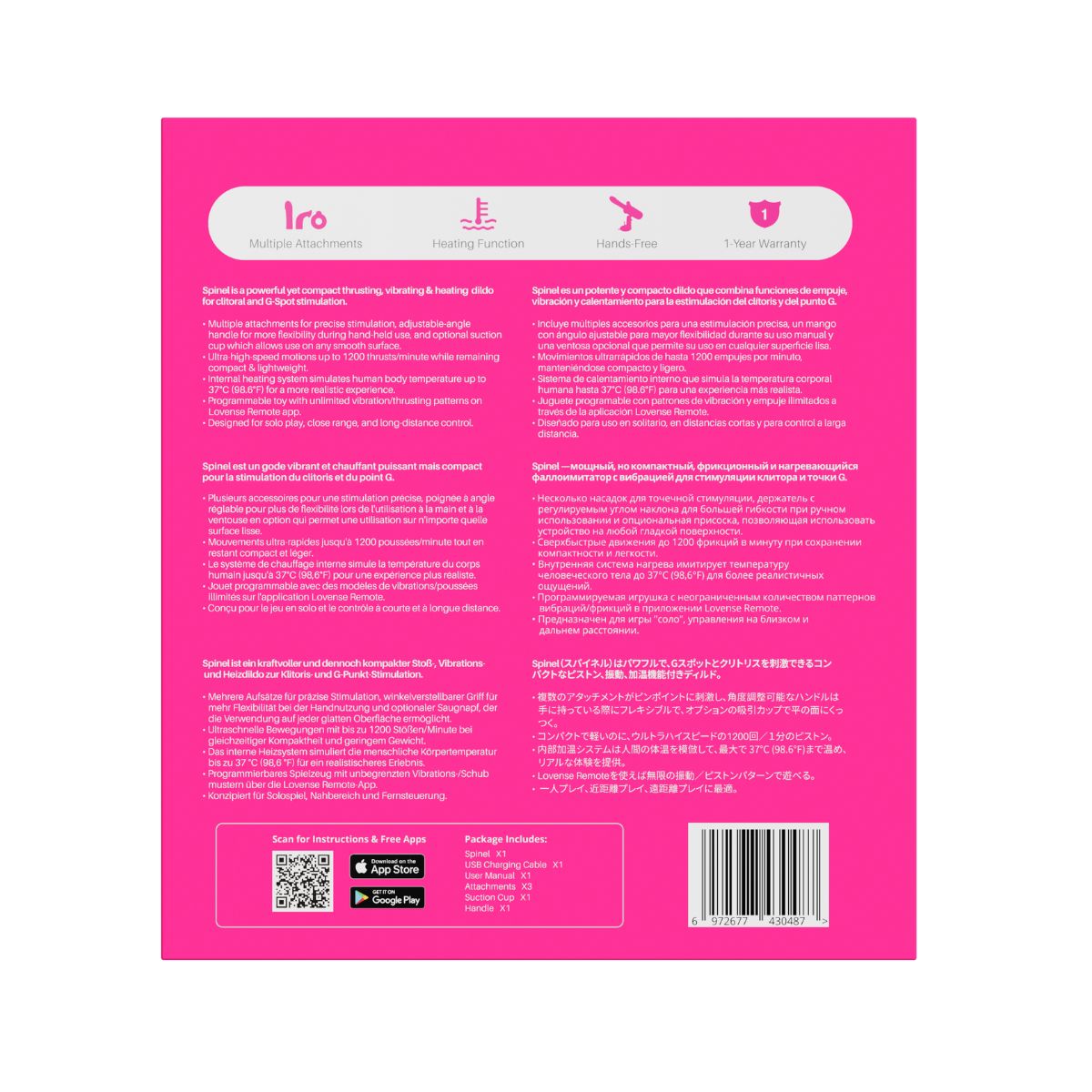 Como Vibrador Interactivo, Spinel se controla desde la app Lovense, permitiéndote ajustar empujes, vibraciones y calefacción en tiempo real. Es ideal para juego en solitario, en pareja o para transmisiones en cámara, brindando control total sin importar la distancia.